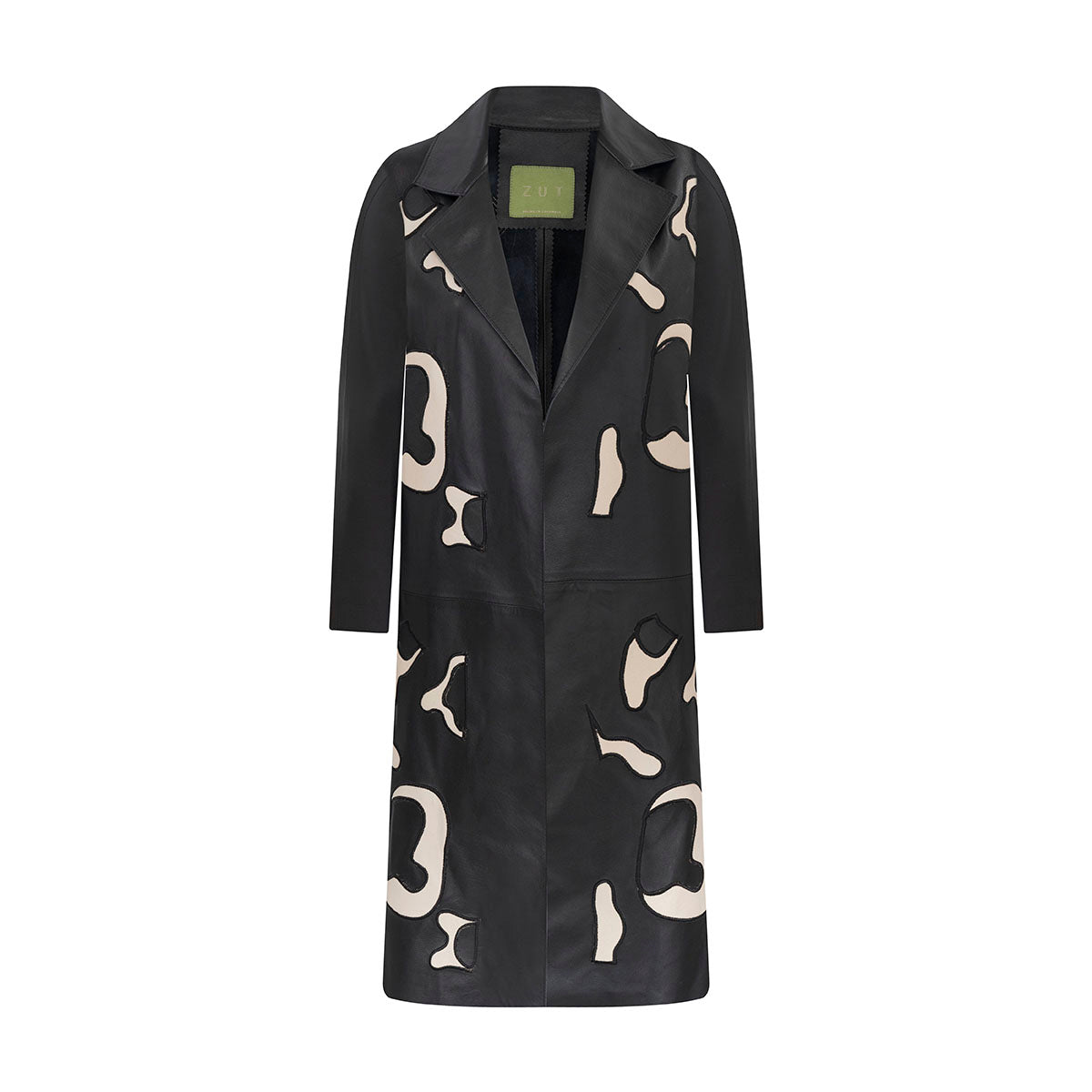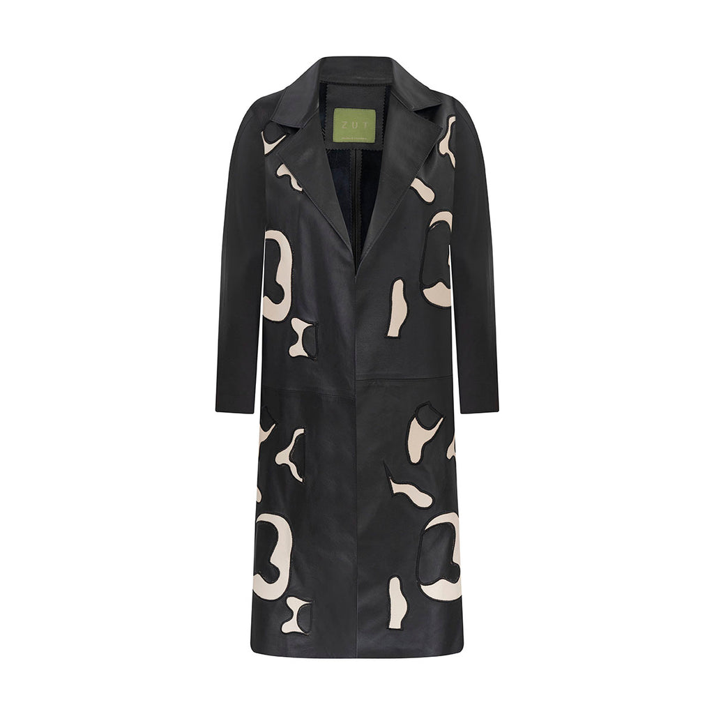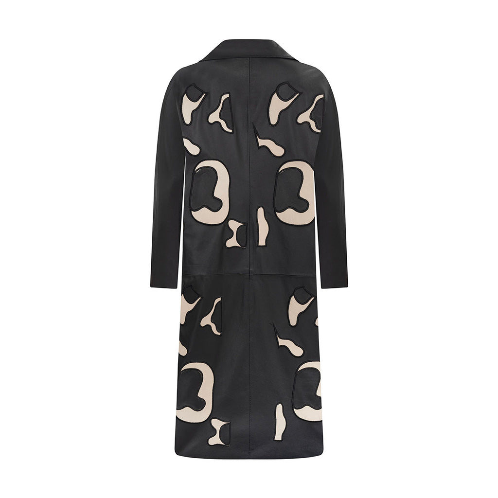 Long black leather coat featuring an abstract cream print that adds a modern artistic touch. Designed with a sharp lapel collar and straight silhouette, it blends contemporary edge with understated sophistication.